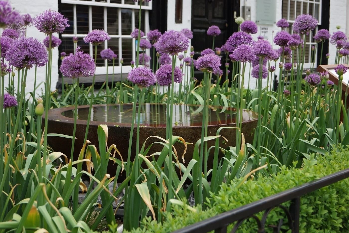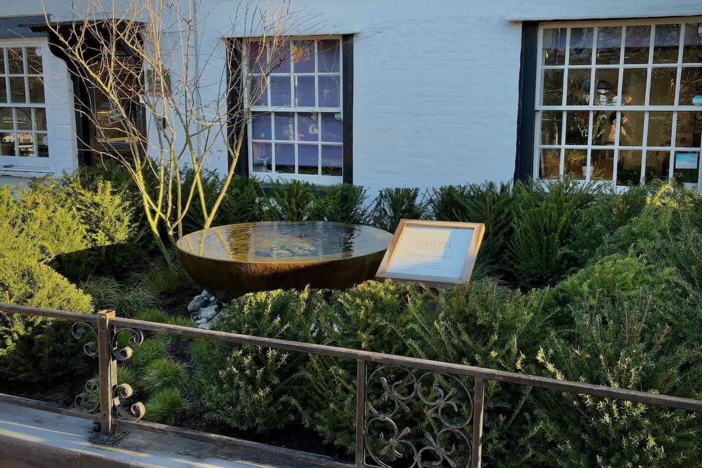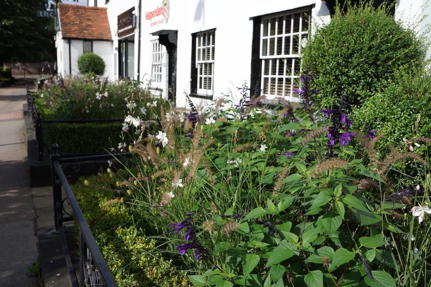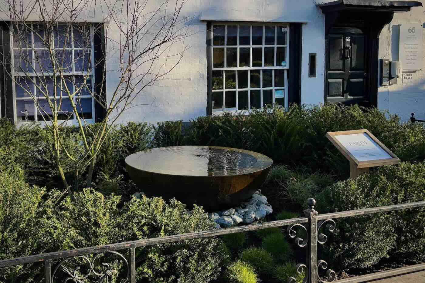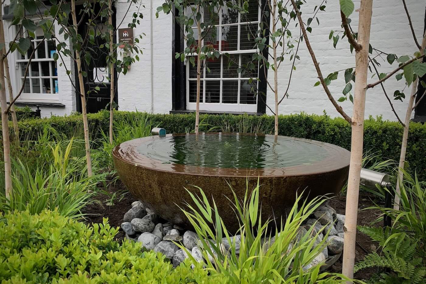 Our High Street garden in Harpenden provides us an opportunity to display our work and planting styles, which we like to change frequently. To add a focal point to the space we have installed a large, corten steel water feature bowl.