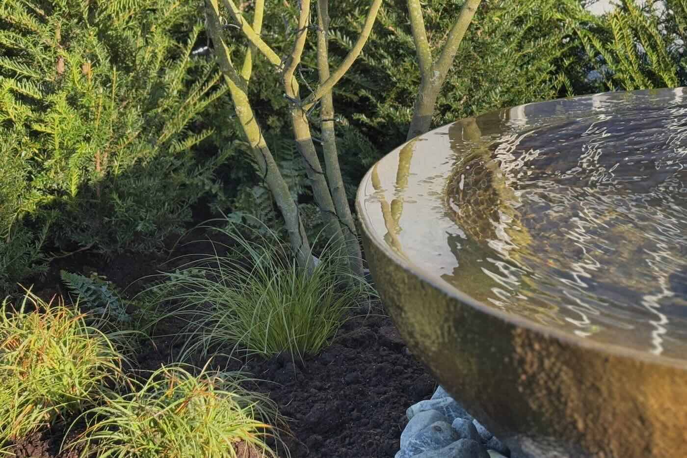 Our most recent scheme features Taxus clipped in to sweeping curves to frame the new planting. We introduced two small, specimen, multi-stem Amelanchier lamarckii trees to add height and interest, alongside a combination of grasses and ferns to create a calming understory around the corten steel water feature.