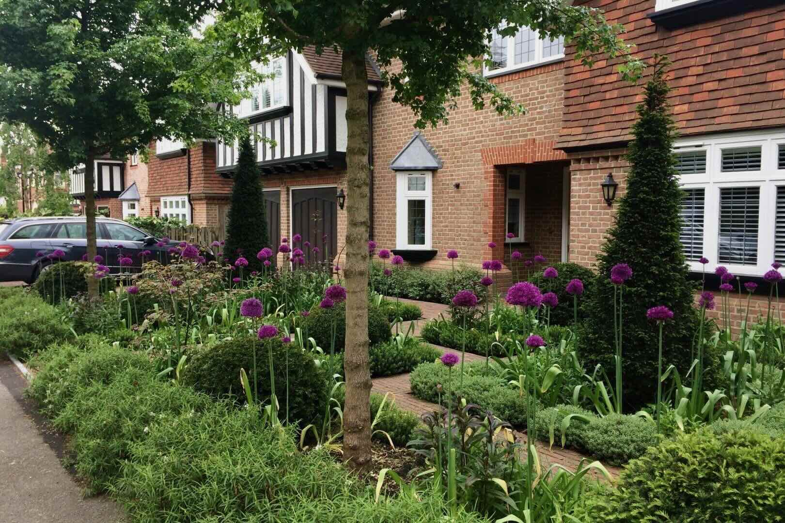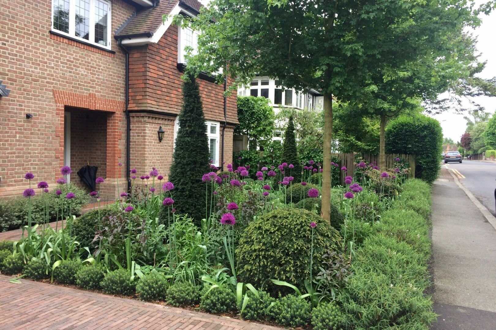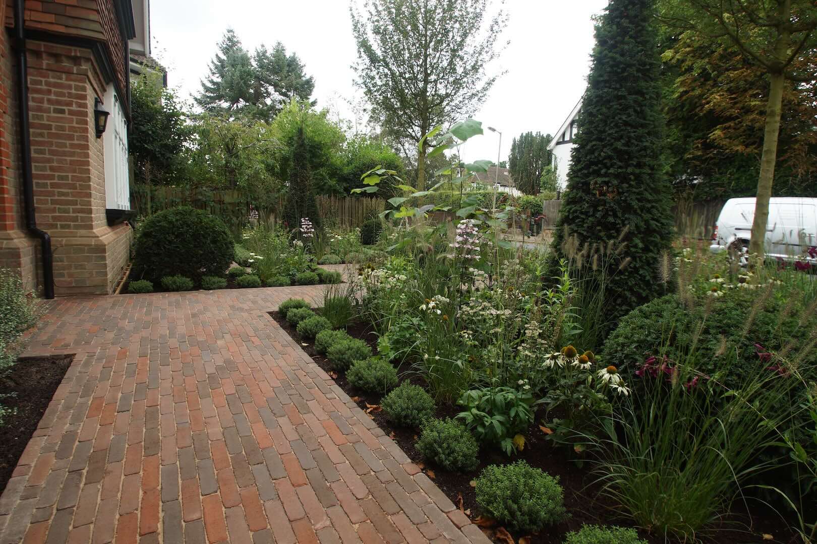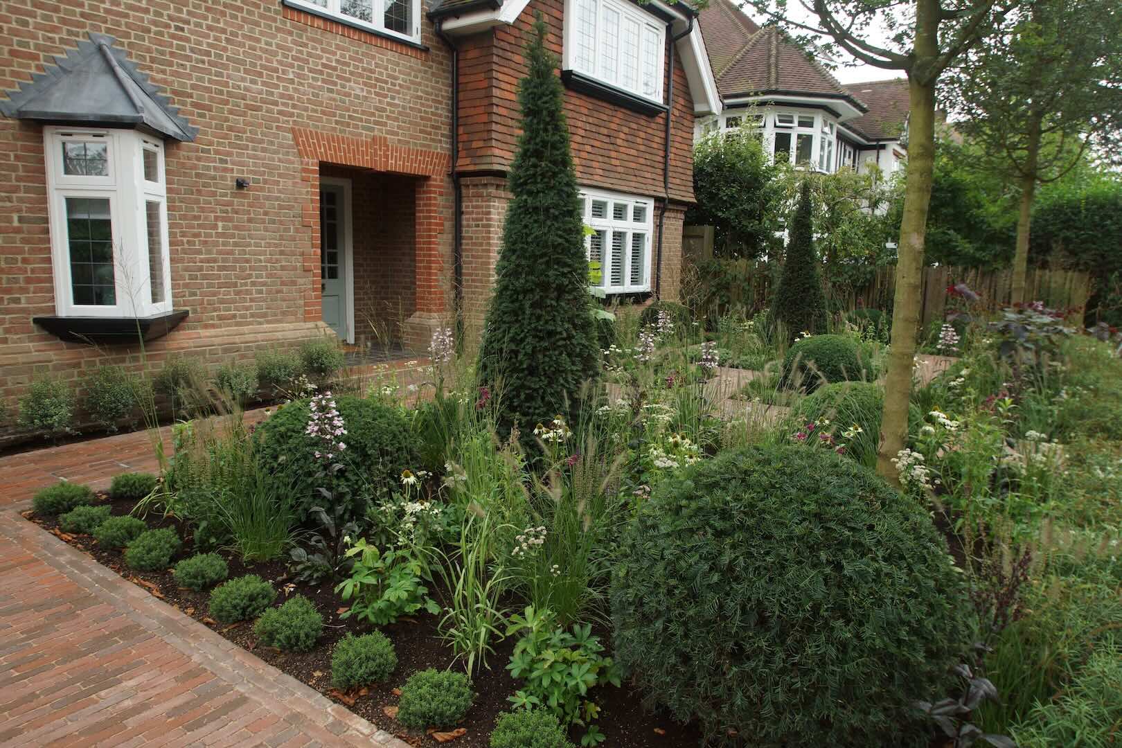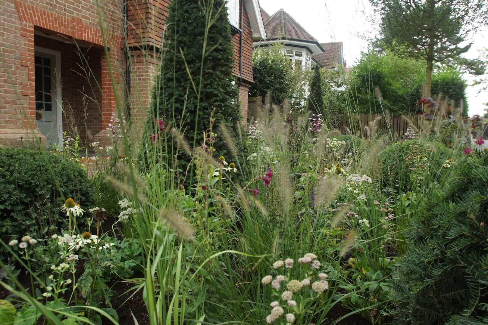 In this front garden, we incorporated sculptural, architectural statement plants to provide height, form, and visual impact. These were combined with informal, naturalistic planting, creating a dynamic contrast between structured and relaxed elements.