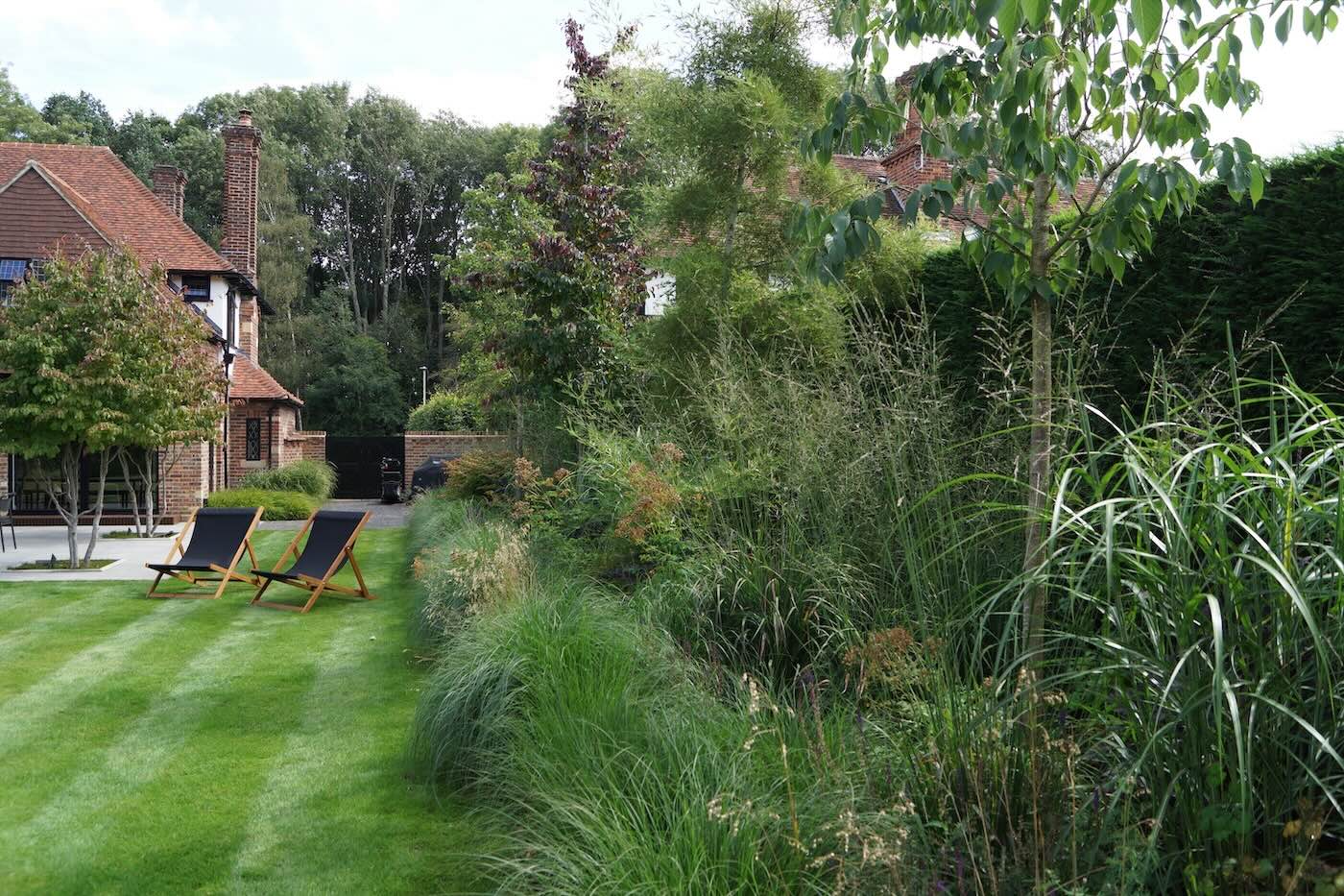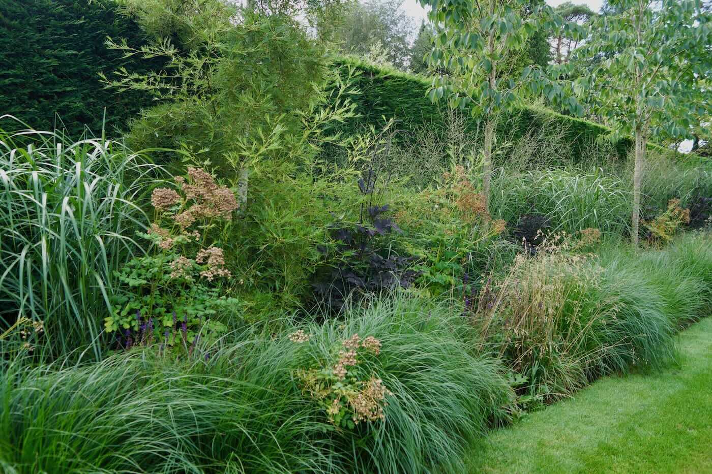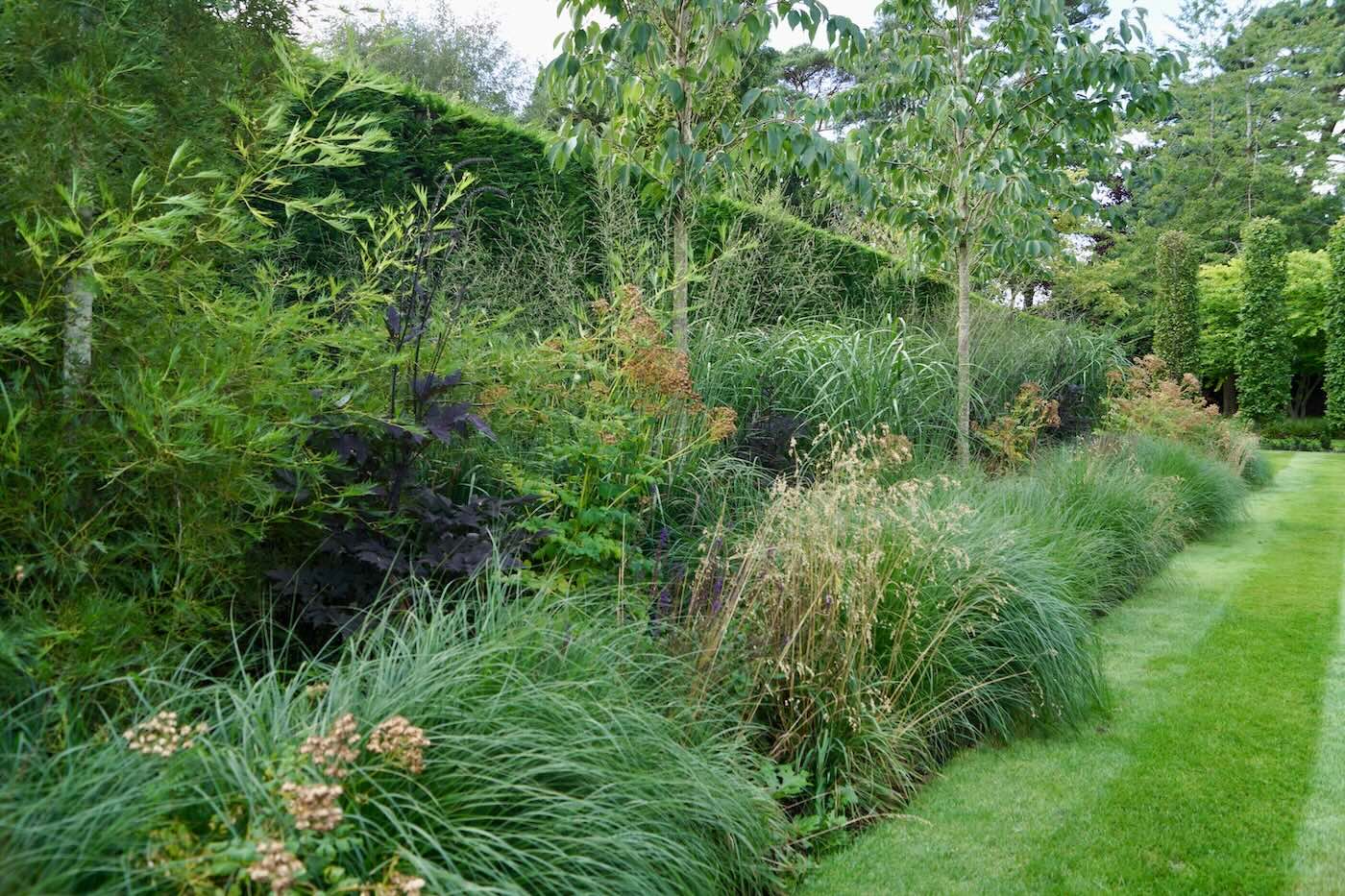 Part of our brief for the remainder of the garden was to create a predominantly green garden, rich in texture and calming in character. We achieved this with large borders and a combination of multi-layered grasses, foliage plants and architectural topiary statements all focussing on the green planting scheme. These large, flowing borders, set against the crisp formal lawn, continue the theme of contrast and juxtaposition.