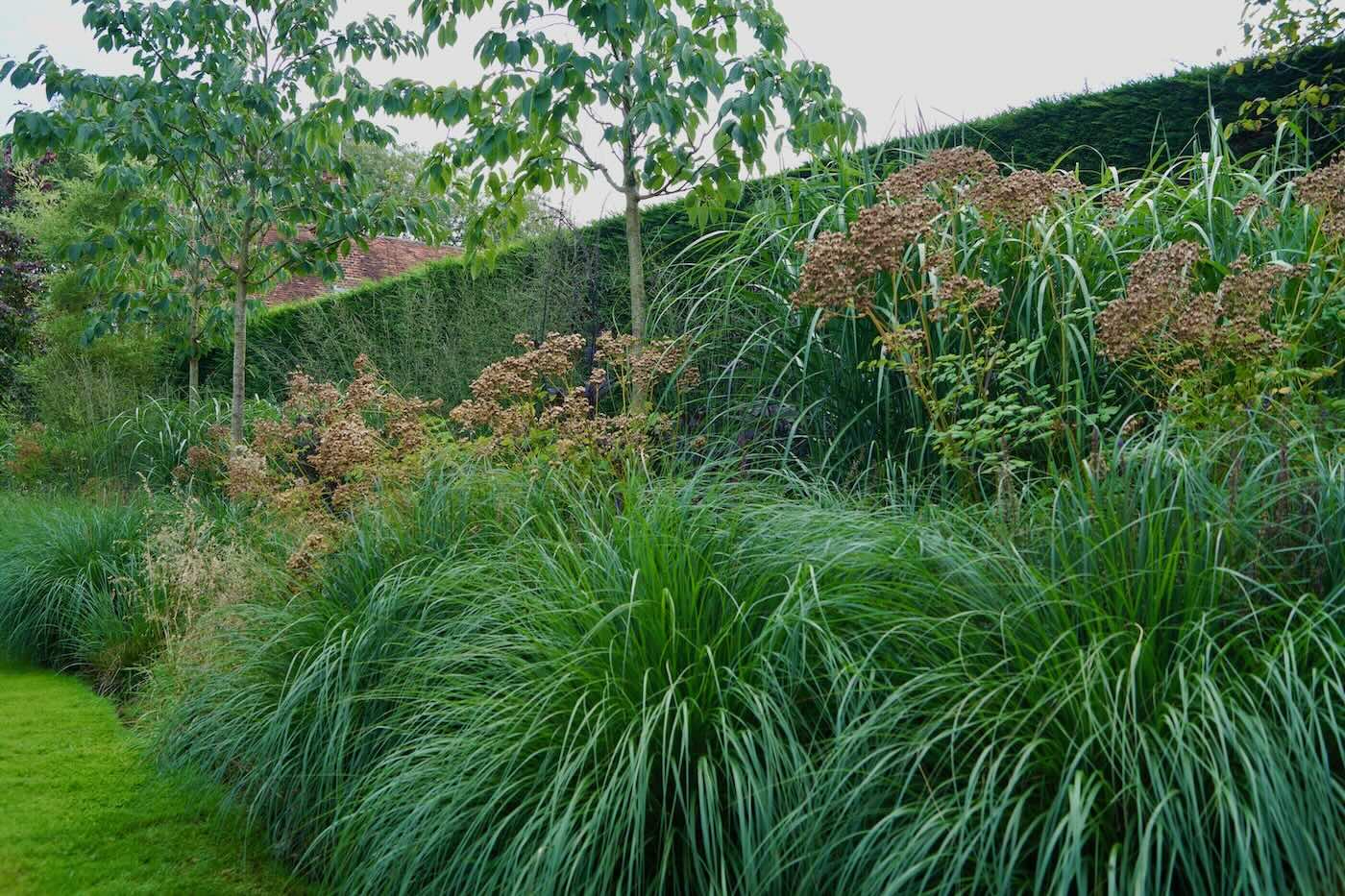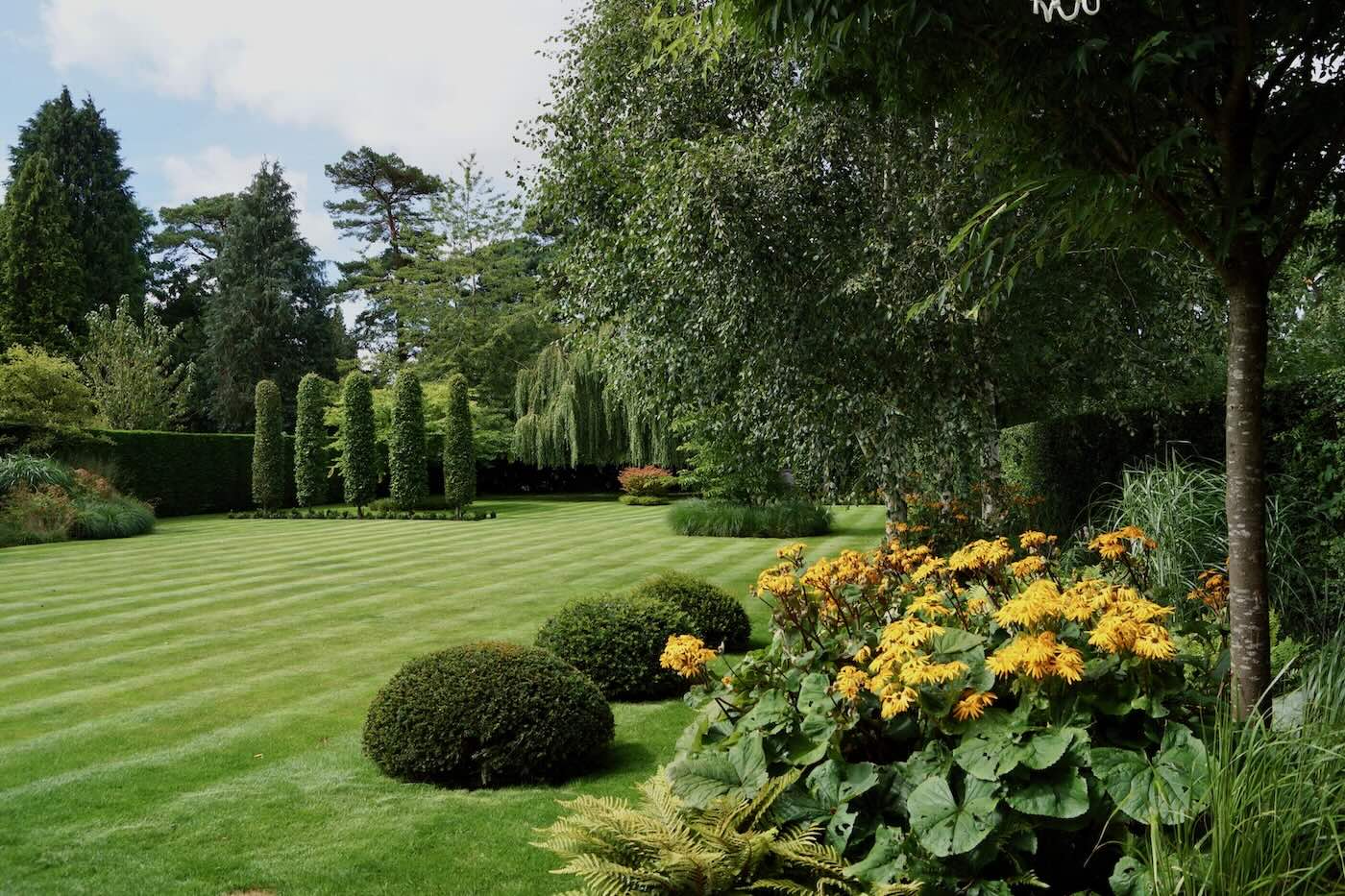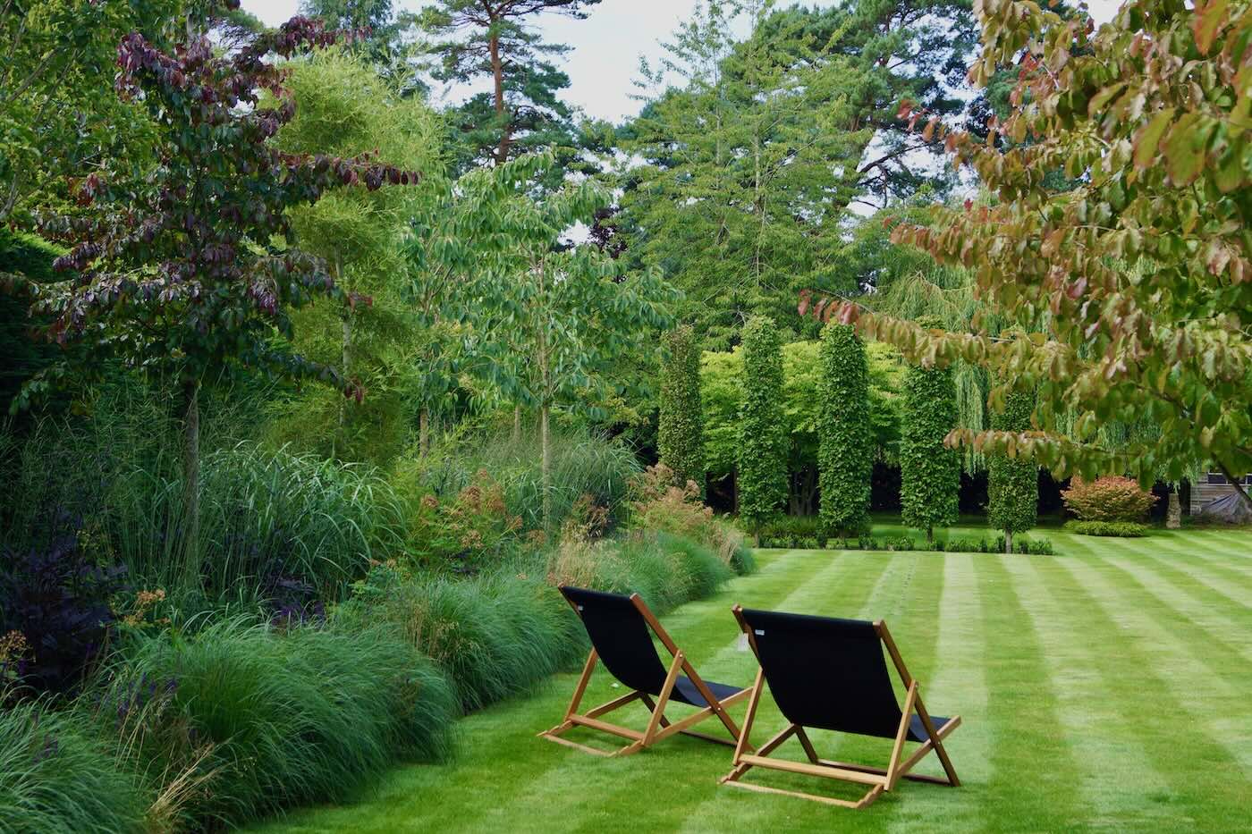 Part of our brief for the remainder of the garden was to create a predominantly green garden, rich in texture and calming in character. We achieved this with large borders and a combination of multi-layered grasses, foliage plants and architectural topiary statements all focussing on the green planting scheme. These large, flowing borders, set against the crisp formal lawn, continue the theme of contrast and juxtaposition.