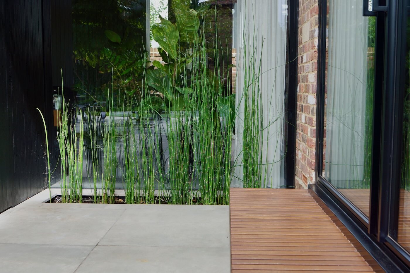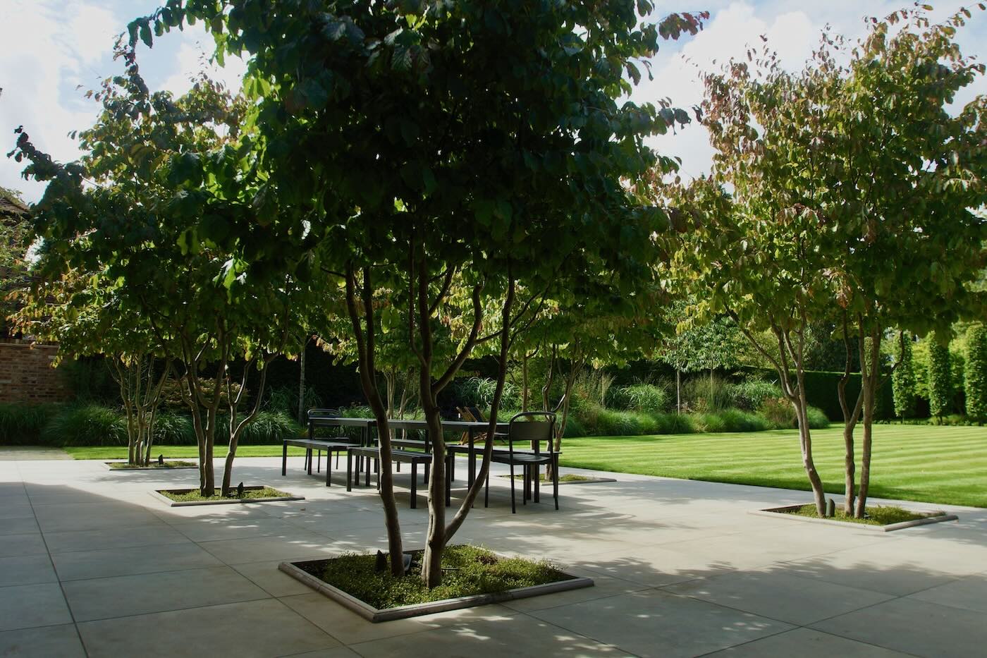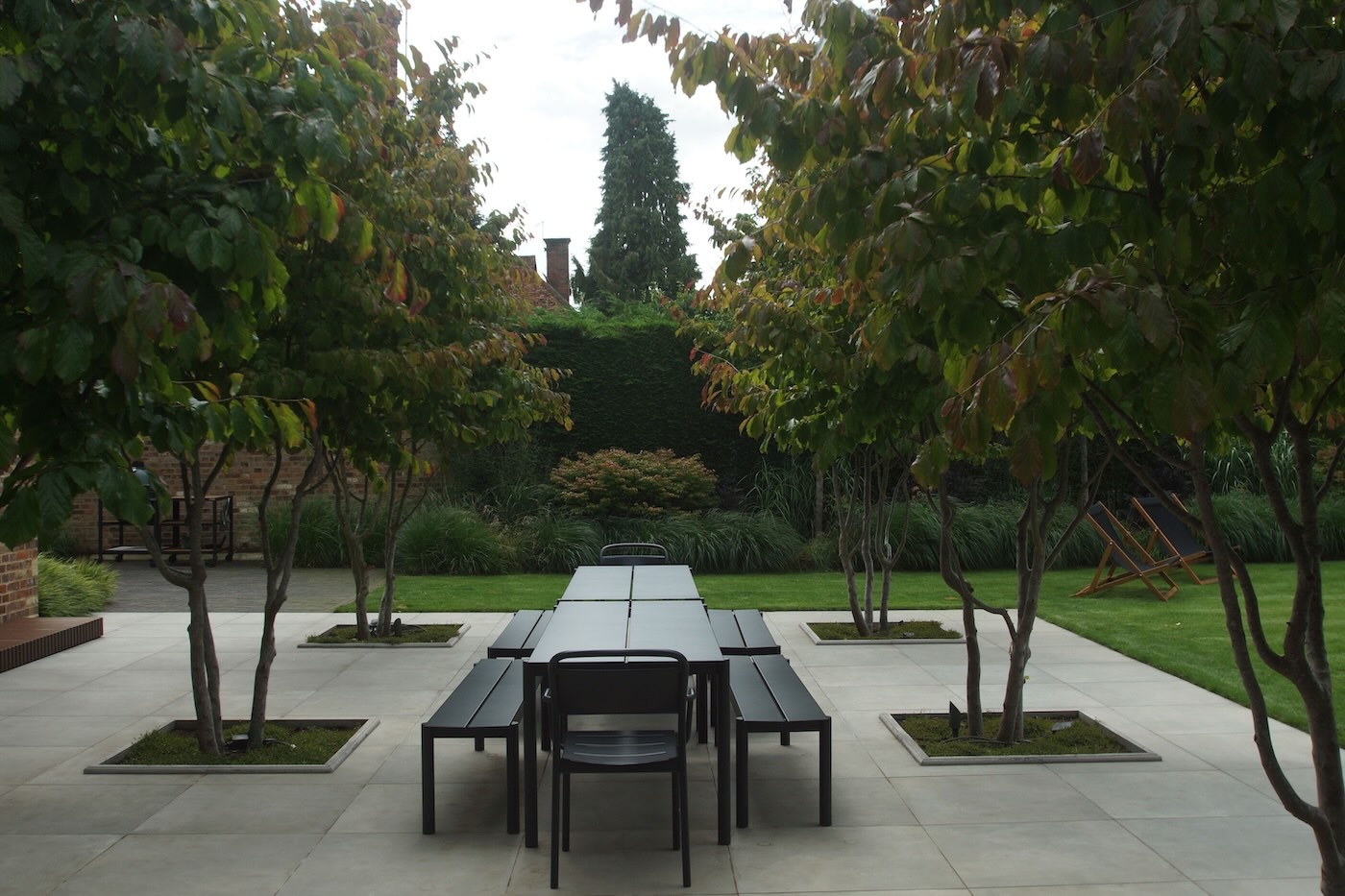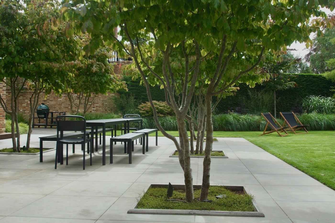 Our clients envisioned a large terrace for entertaining and dining that would complement the stylish new addition at the rear of their property. We aimed to create a space that was both strong in presence and character, yet simple and elegant. Characteristic multi-stem trees were used to define the terrace, provide shelter and enclosure, and introduce a bold architectural element. Their twisted stems create a striking contrast against the crisp lines of the industrial-style, large-format concrete tiles. A long feature hardwood slatted step links the garden to the interior of the property, offering a soft, natural transition while serving as a sculptural focal point in its own right.