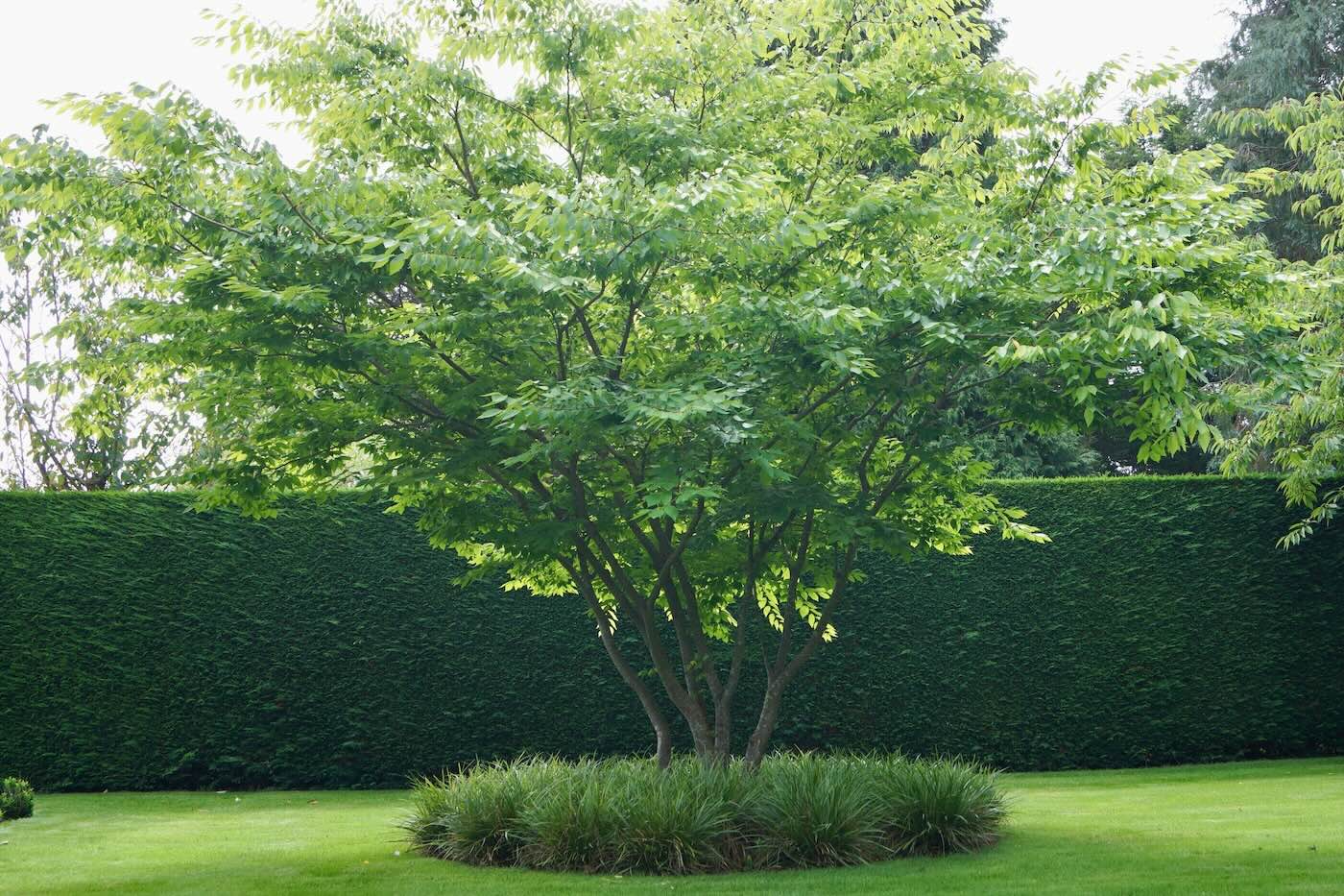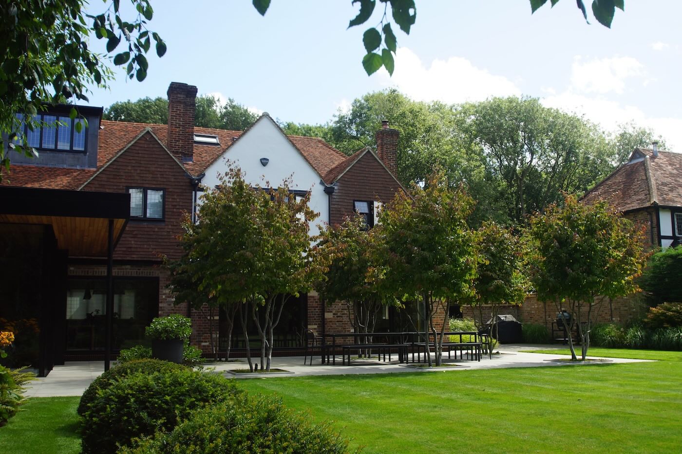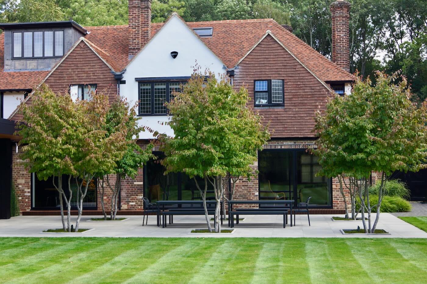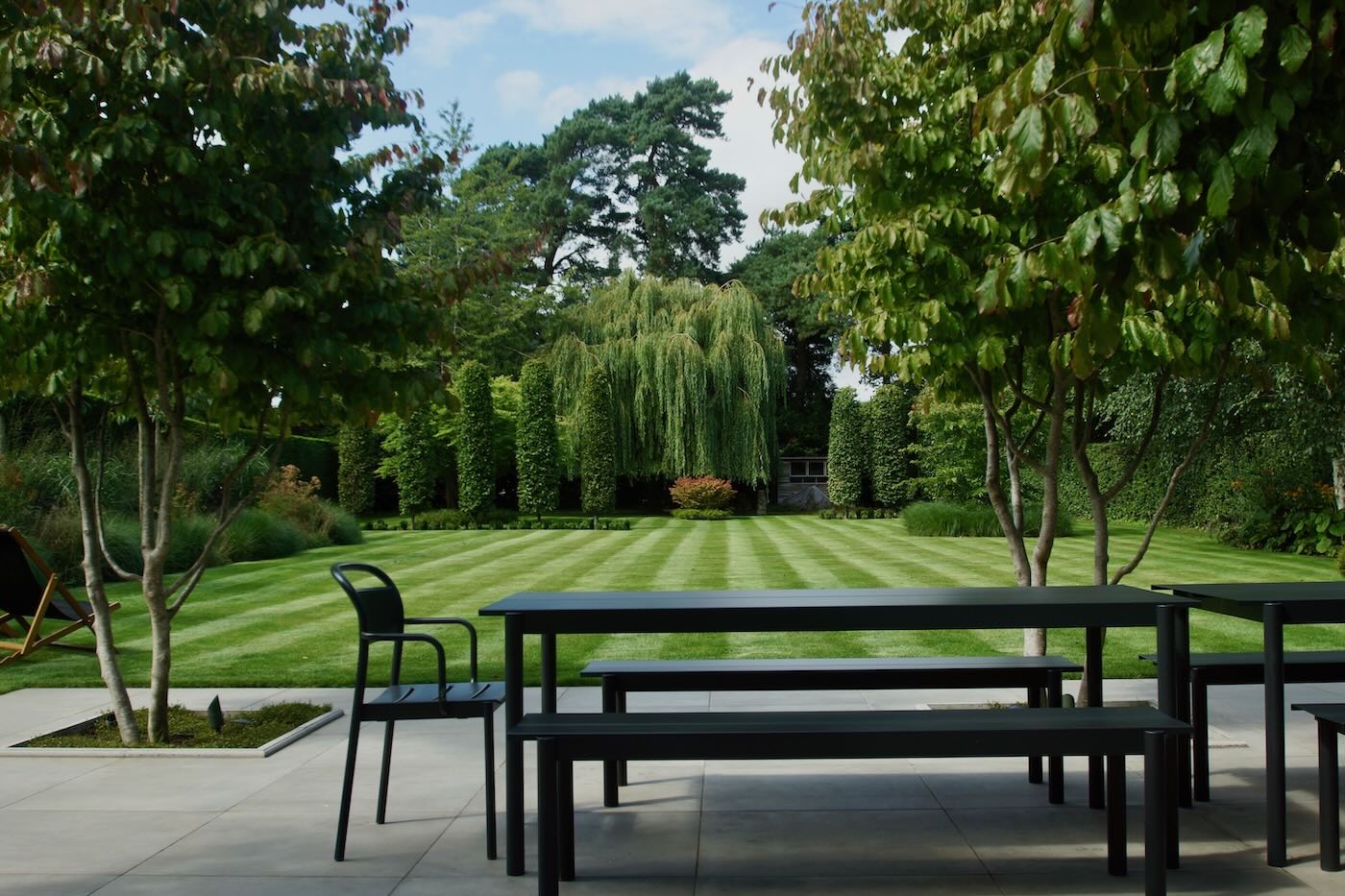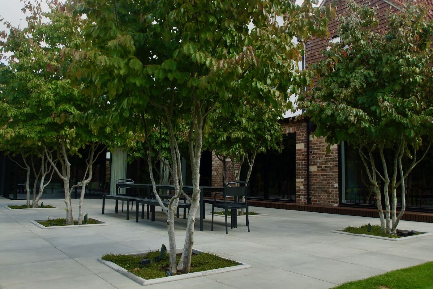 Our clients envisioned a large terrace for entertaining and dining that would complement the stylish new addition at the rear of their property. We aimed to create a space that was both strong in presence and character, yet simple and elegant. Characteristic multi-stem trees were used to define the terrace, provide shelter and enclosure, and introduce a bold architectural element. Their twisted stems create a striking contrast against the crisp lines of the industrial-style, large-format concrete tiles. A long feature hardwood slatted step links the garden to the interior of the property, offering a soft, natural transition while serving as a sculptural focal point in its own right.