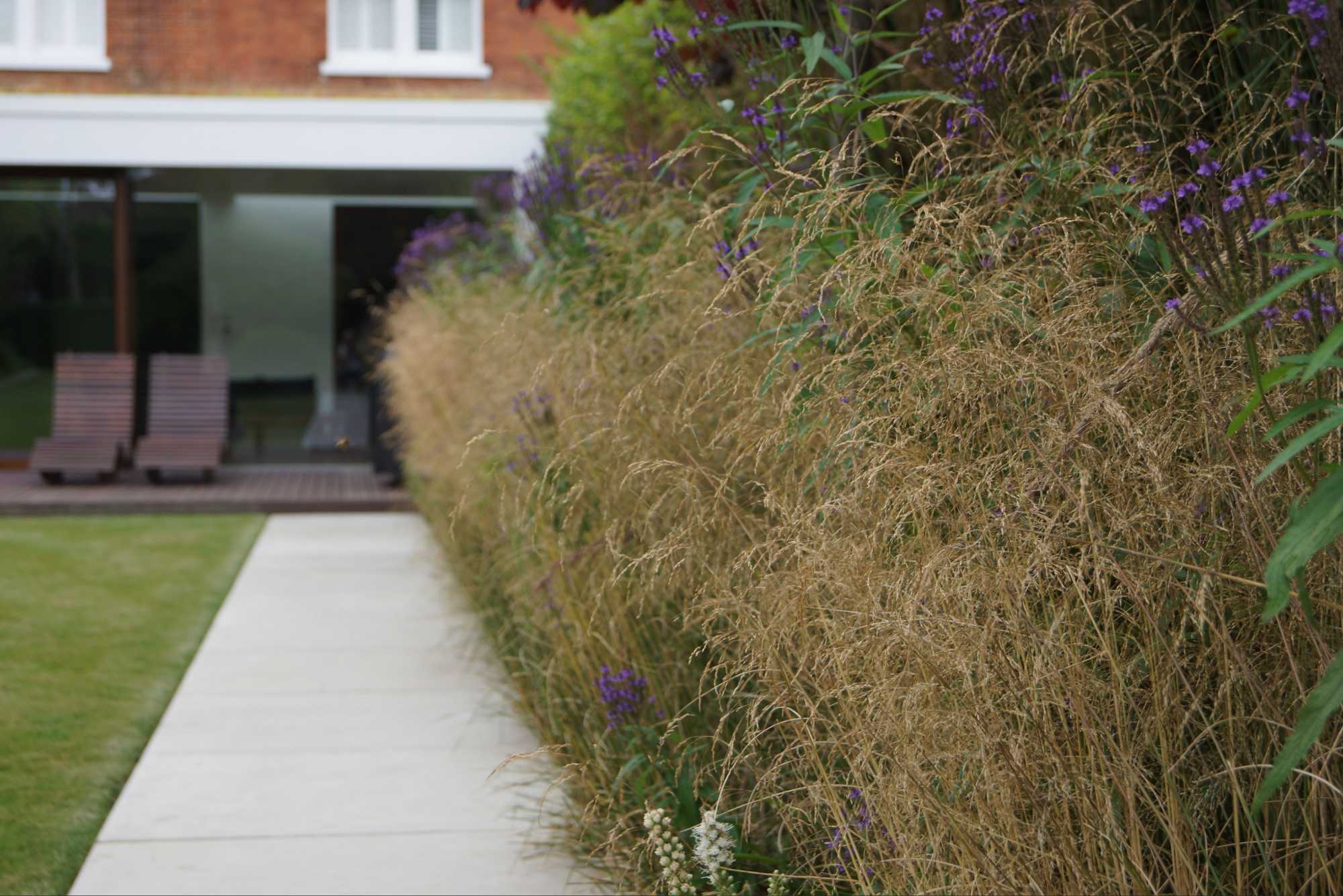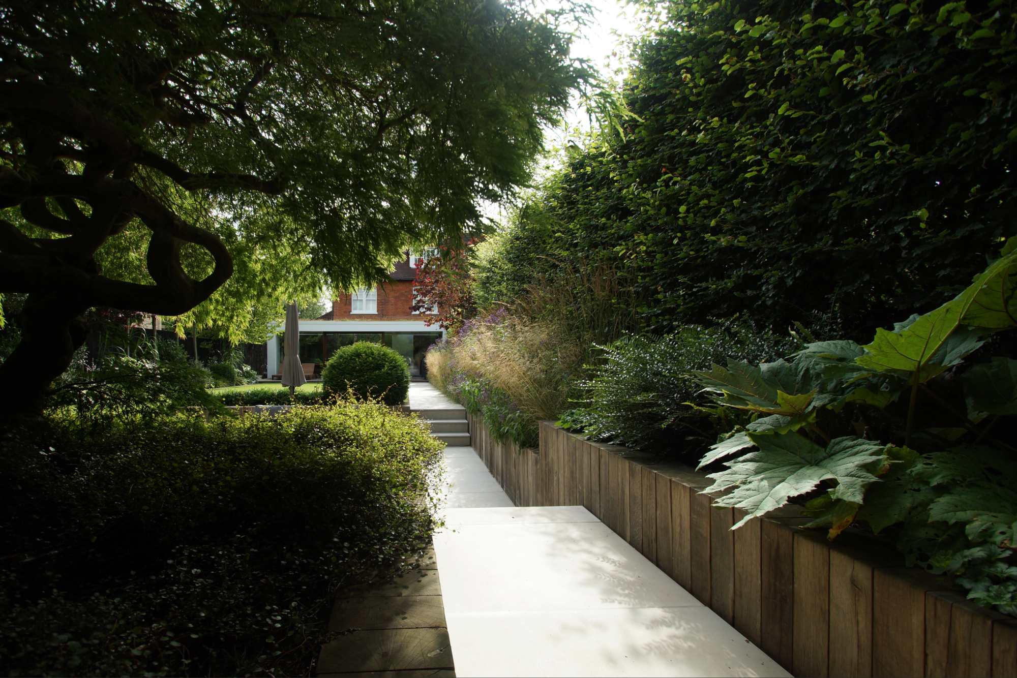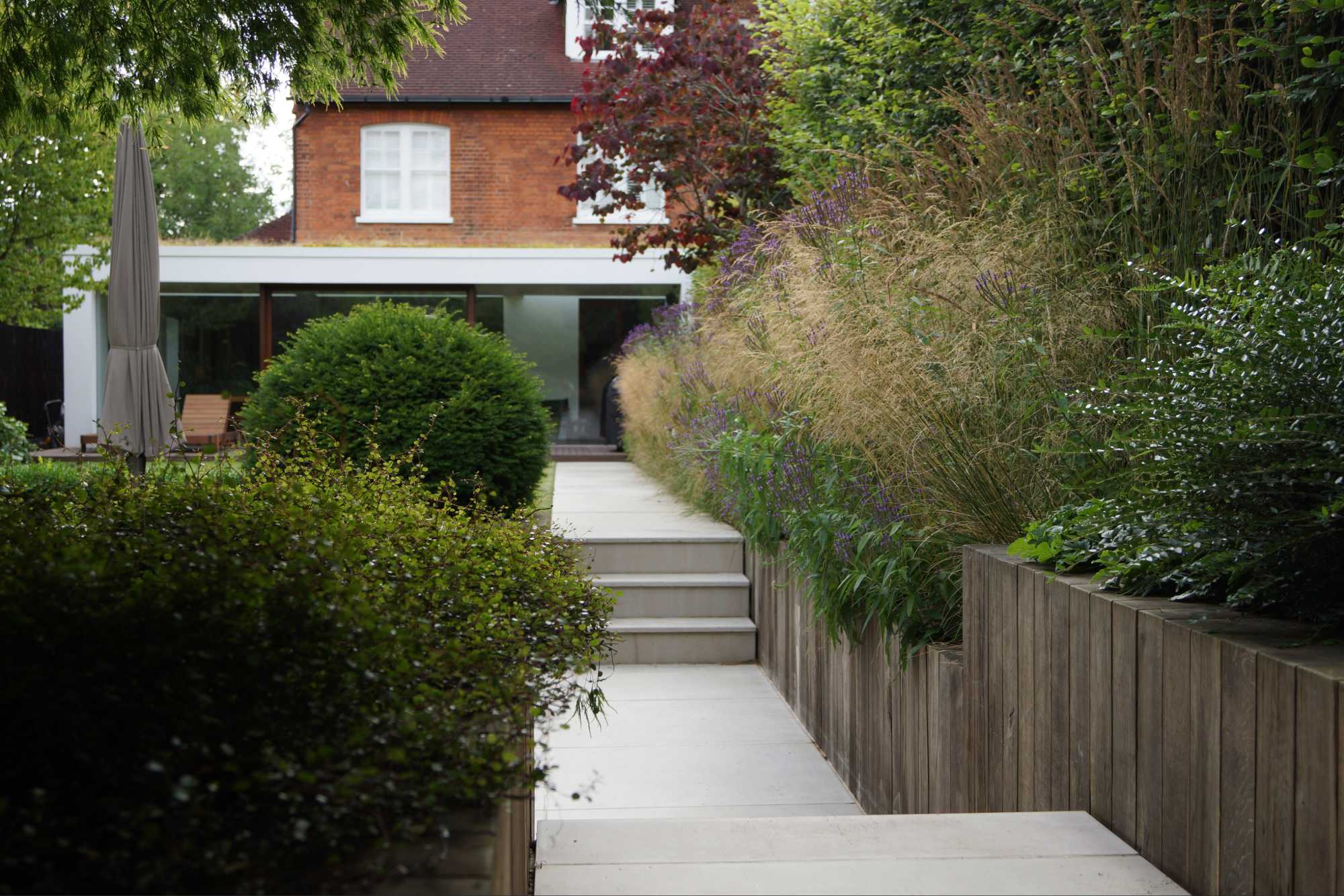 Our clients wanted a tranquil, calming space to escape to from their busy lives. The modern addition to the rear of this period property set the scene for us to create a calm and balanced garden. This was achieved by combining bold, clean lines with architectural and naturalistic planting, and by contrasting natural materials with polished concrete paving.