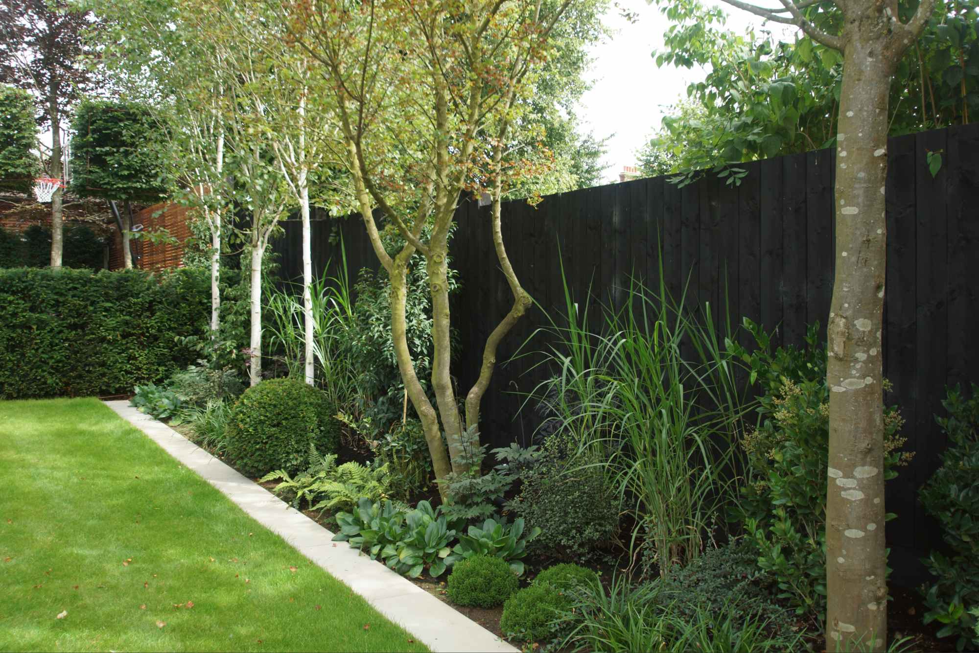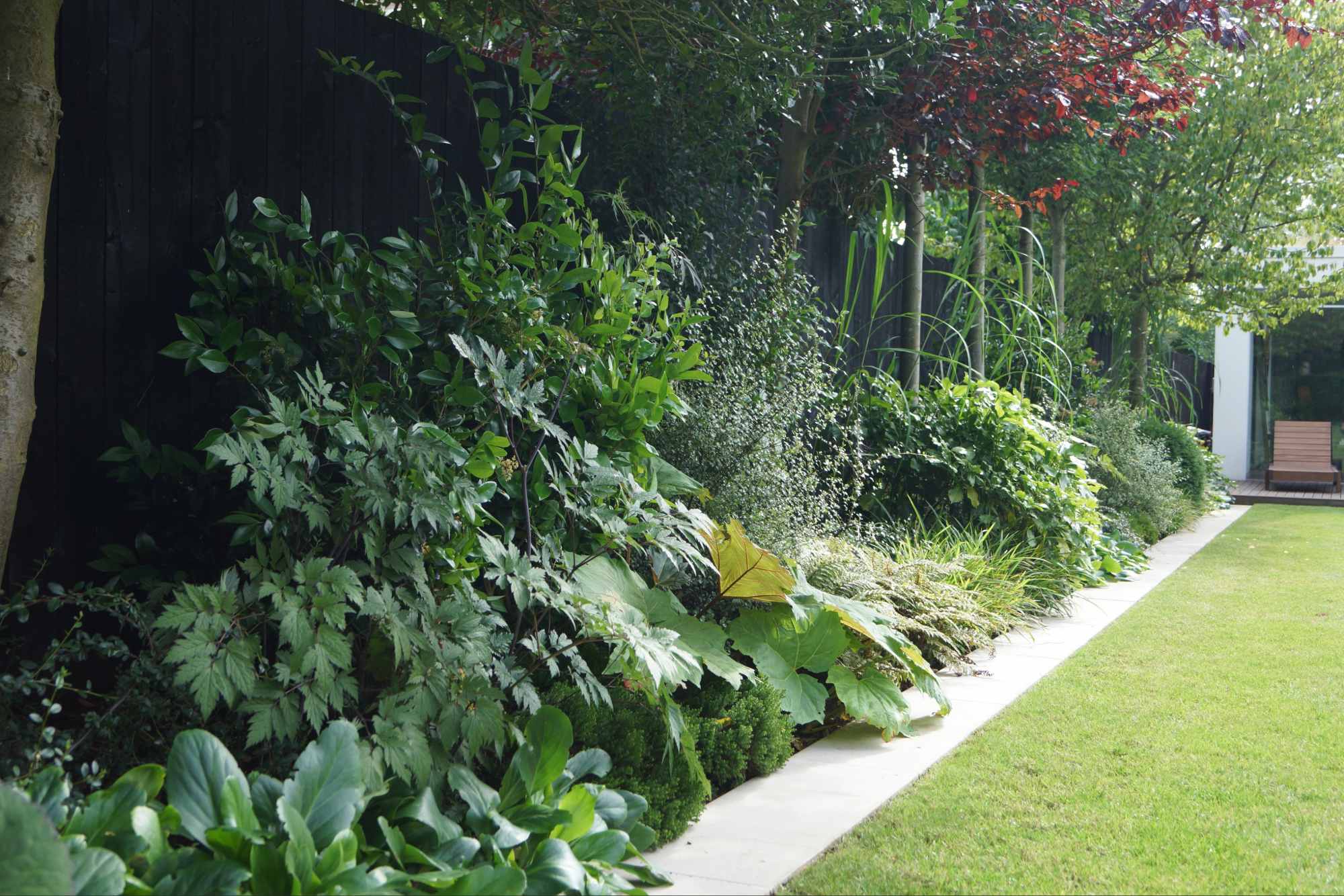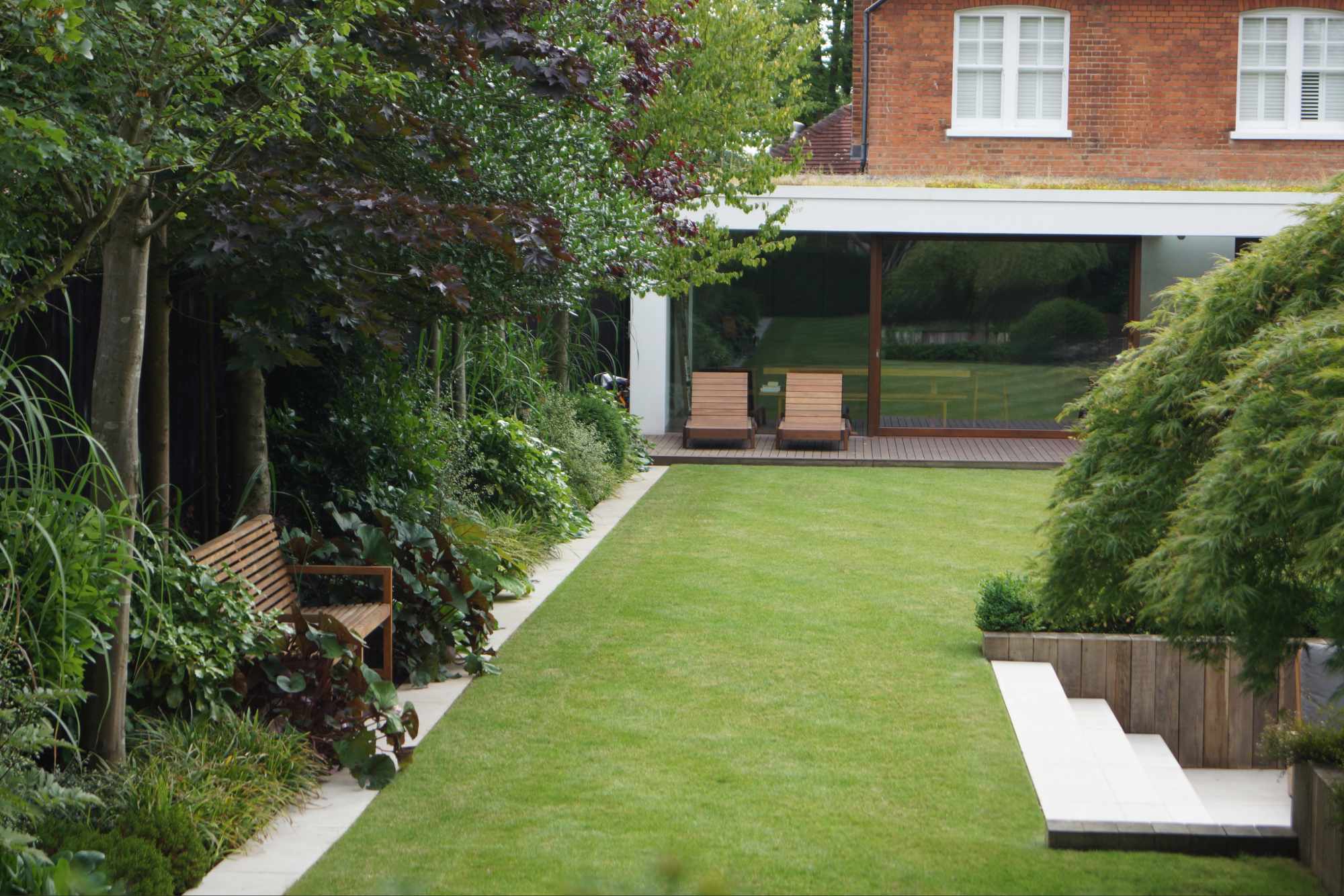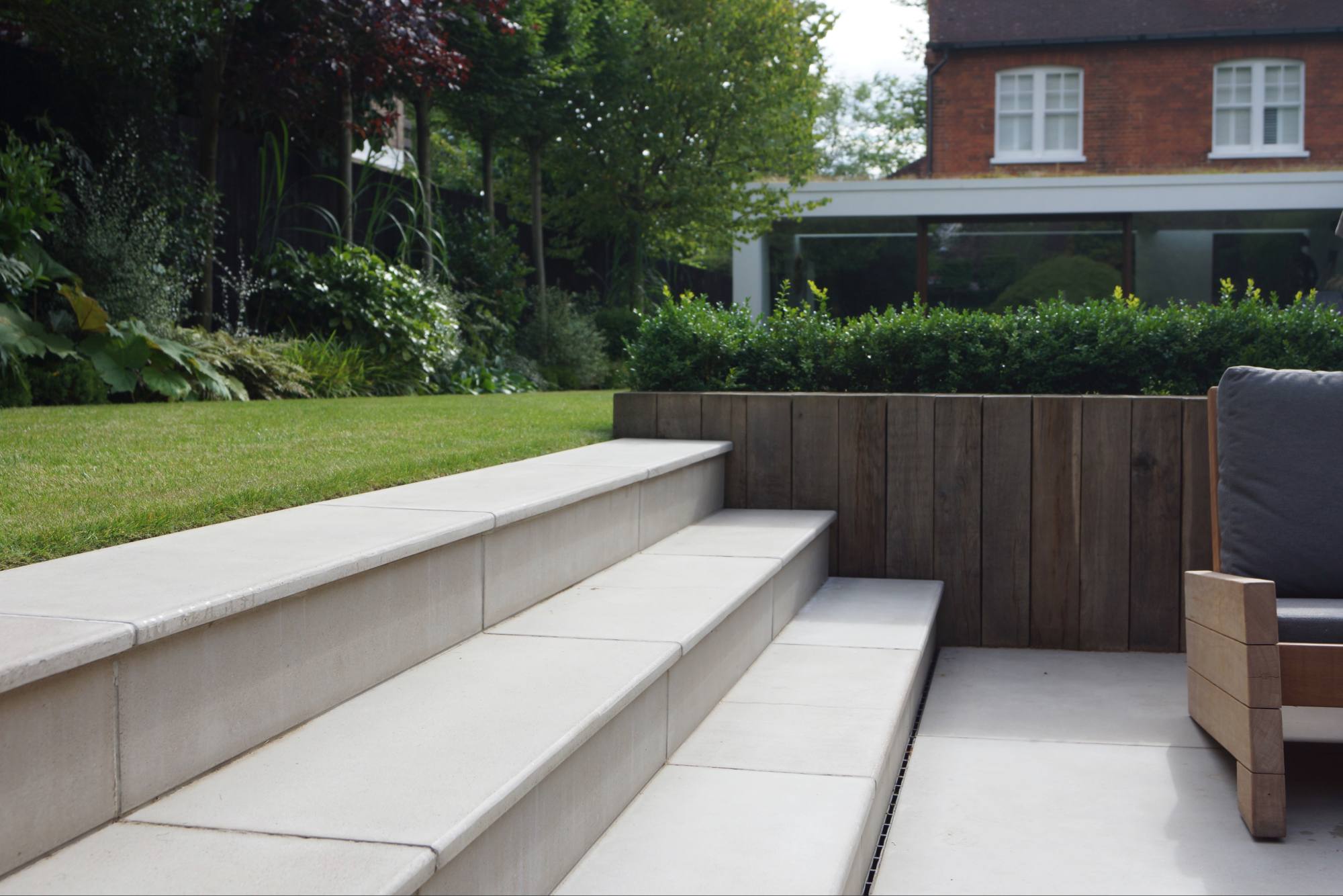 Our clients wanted a tranquil, calming space to escape to from their busy lives. The modern addition to the rear of this period property set the scene for us to create a calm and balanced garden. This was achieved by combining bold, clean lines with architectural and naturalistic planting, and by contrasting natural materials with polished concrete paving.