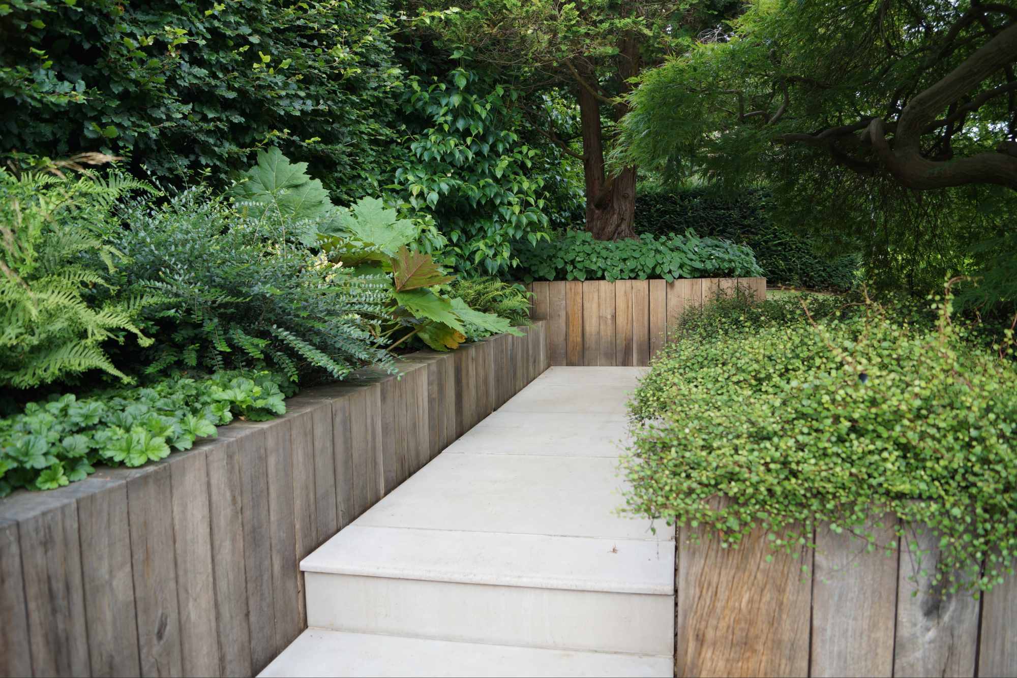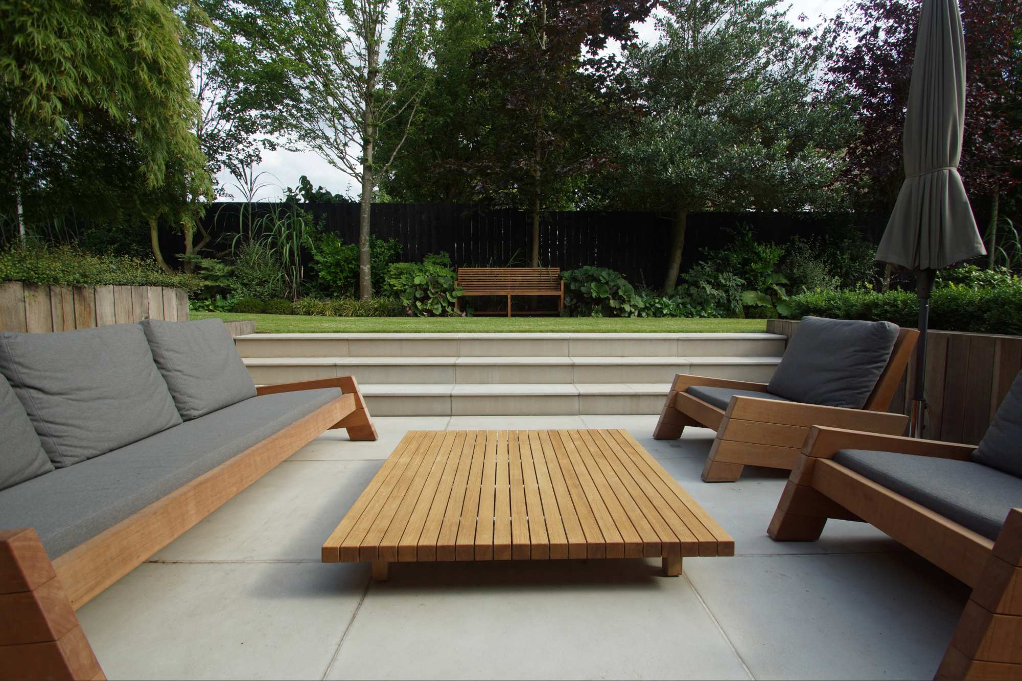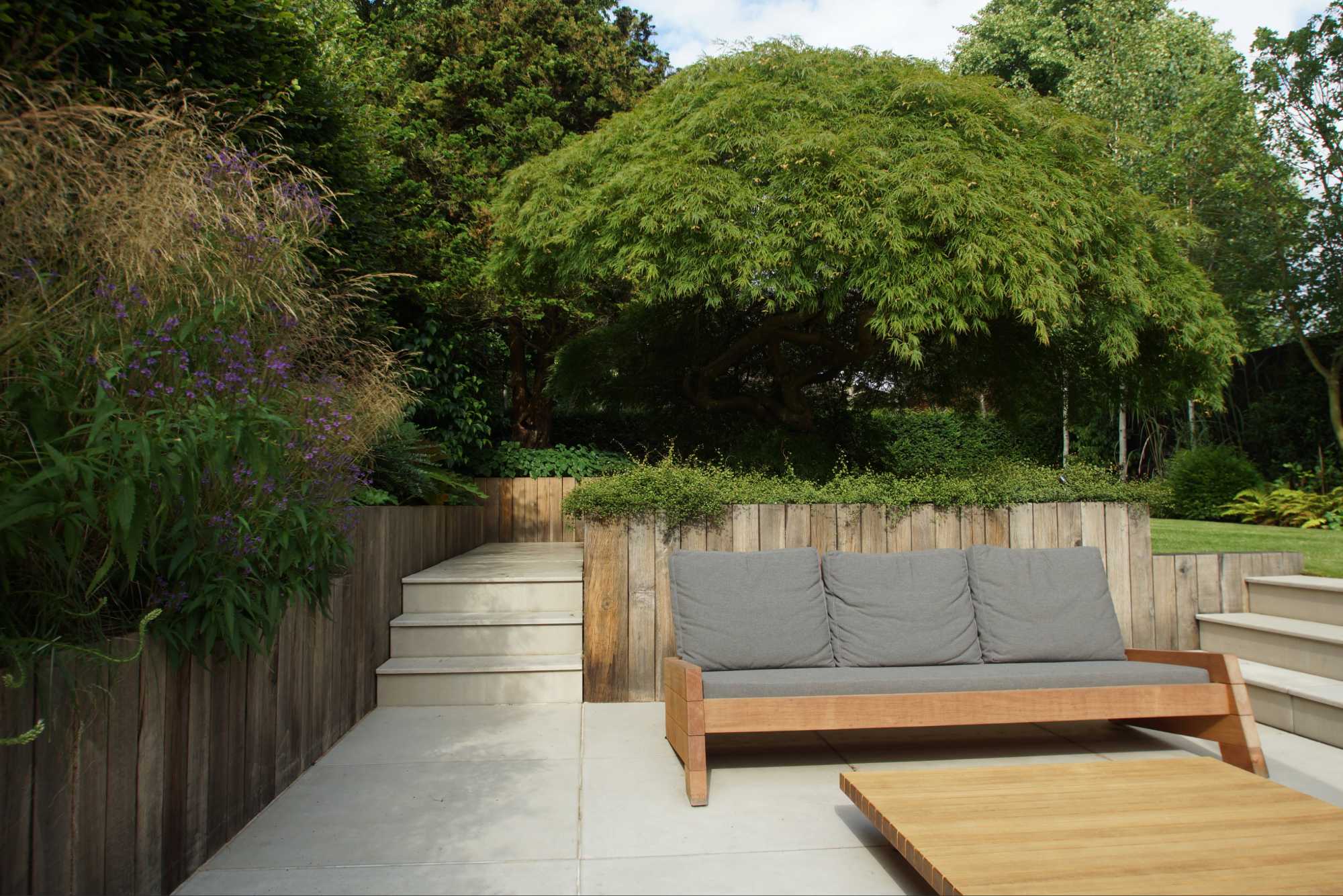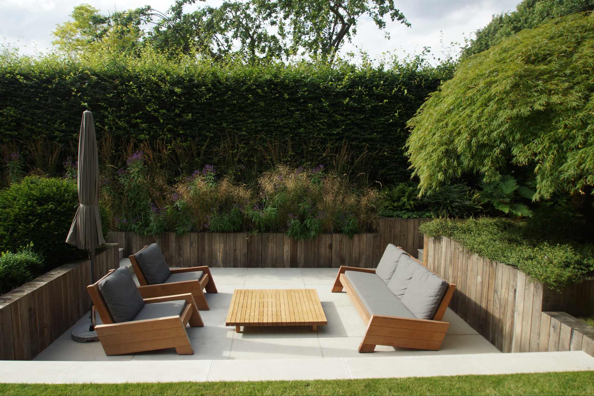 The creation of a sunken seating area gives our clients a sheltered space for relaxation and entertaining. Surrounded by weathered oak, swathes of naturalistic planting, and calming shades of green, this area offers a truly tranquil experience.