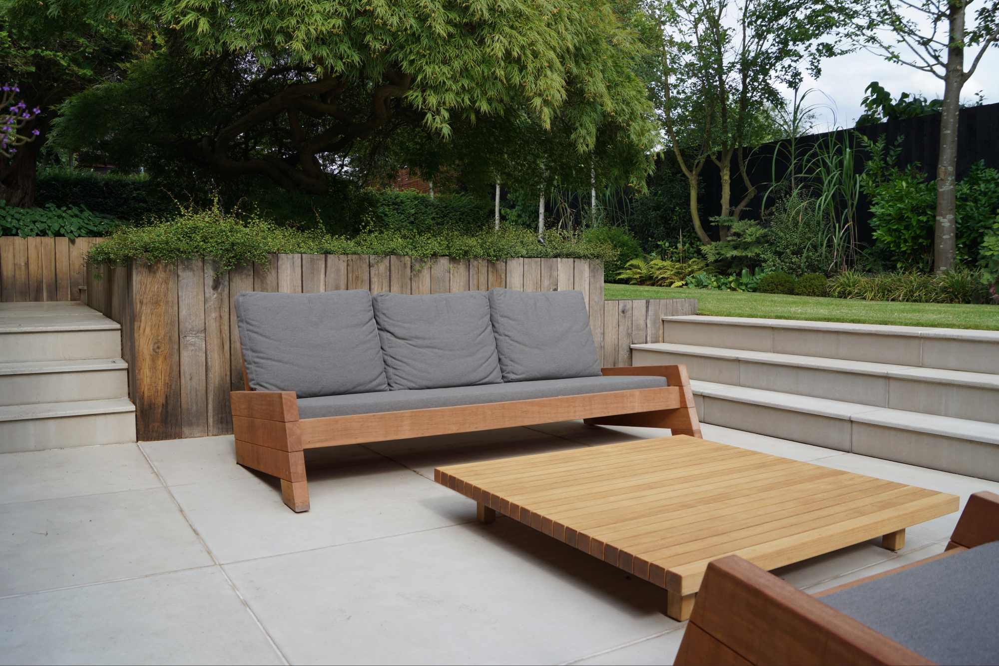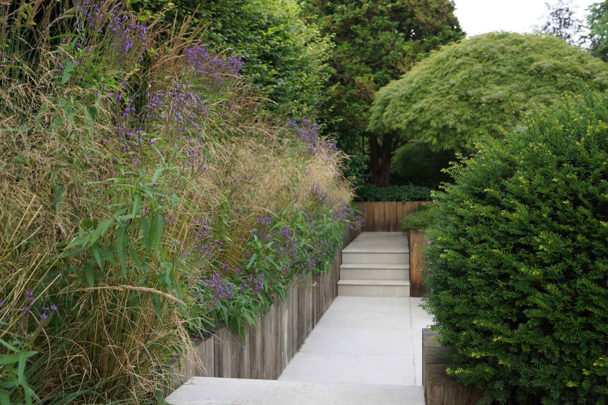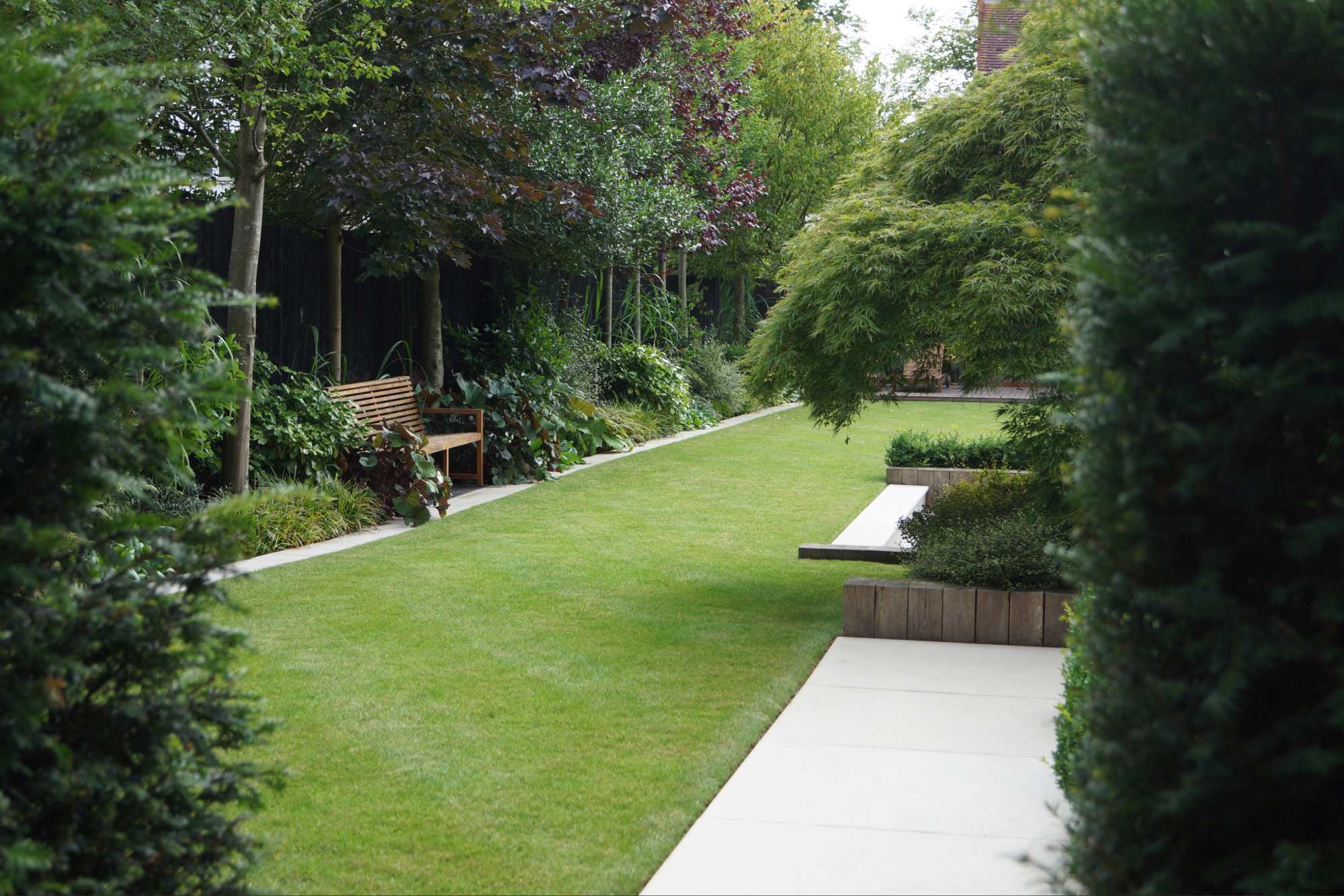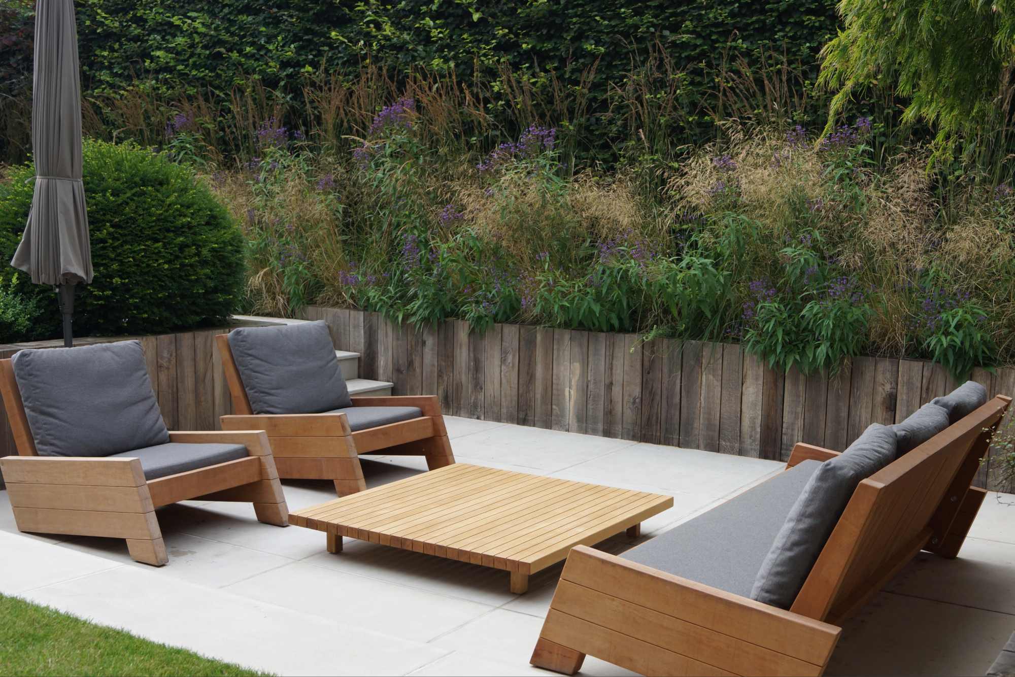 The creation of a sunken seating area gives our clients a sheltered space for relaxation and entertaining. Surrounded by weathered oak, swathes of naturalistic planting, and calming shades of green, this area offers a truly tranquil experience.