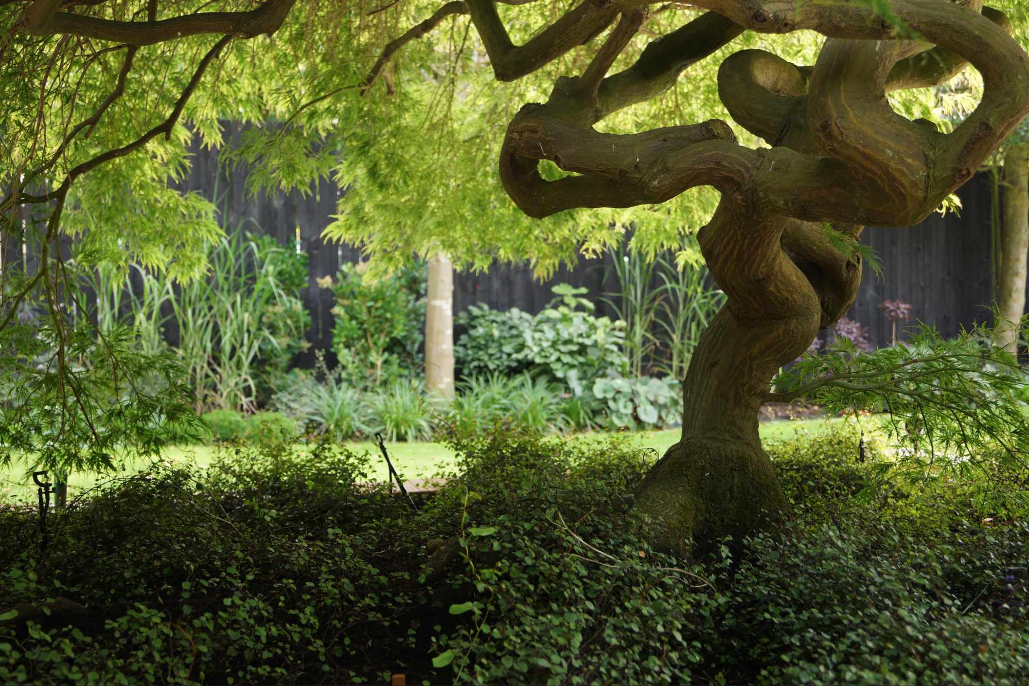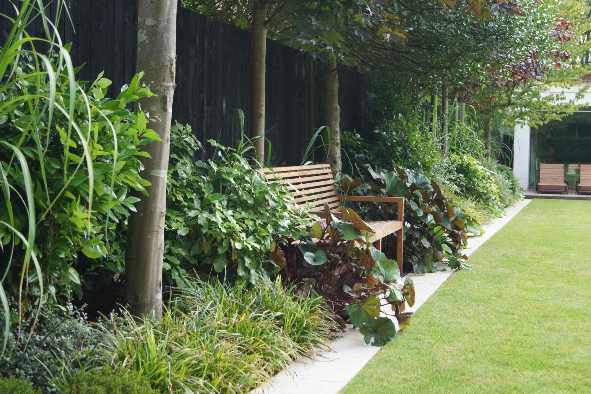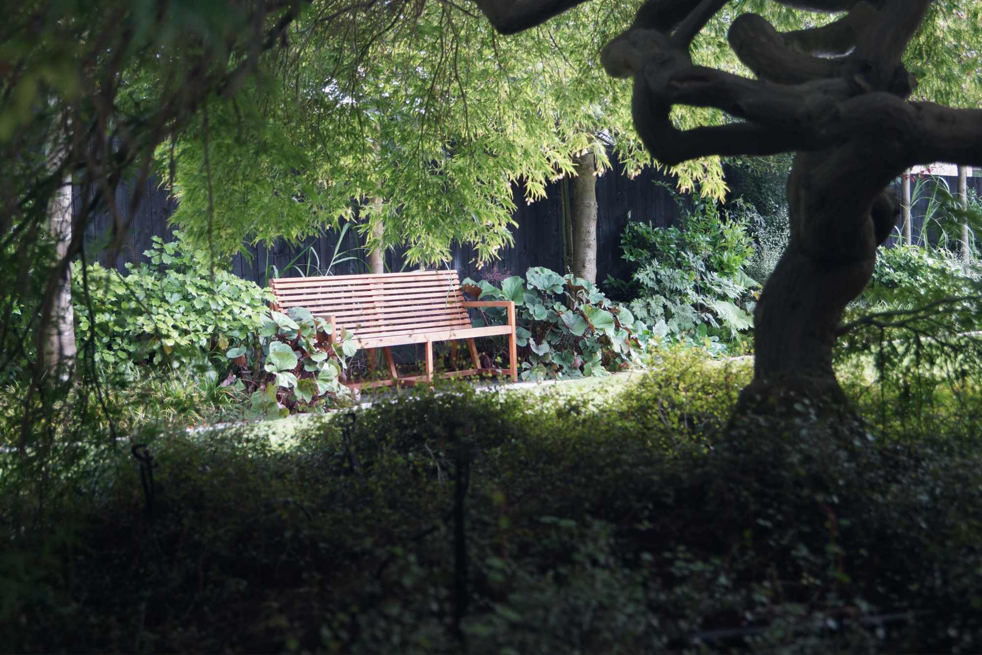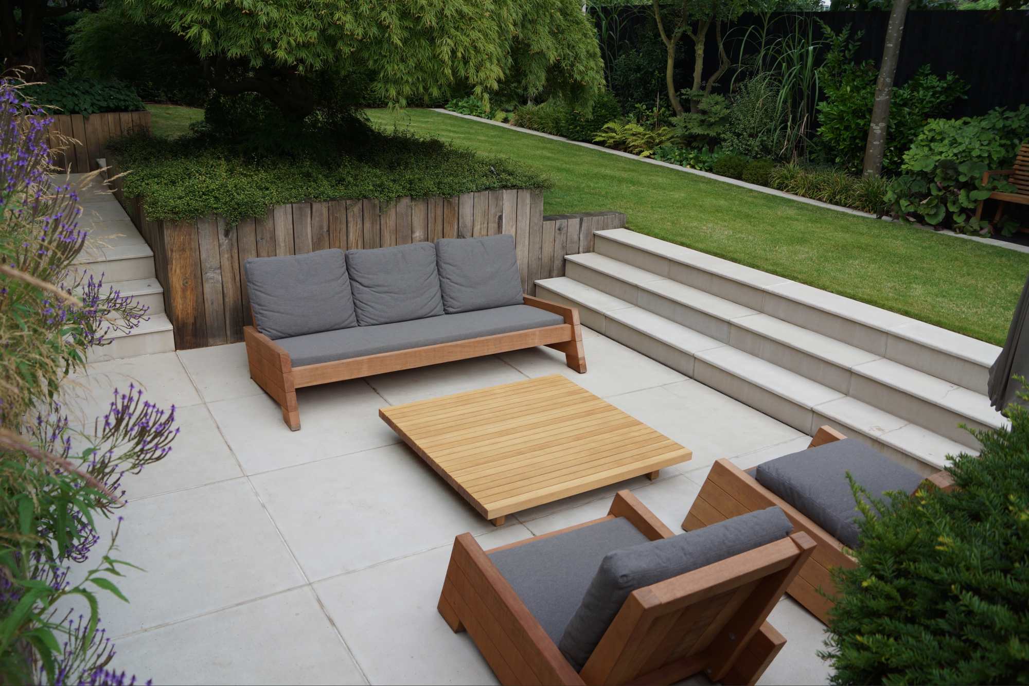 The creation of a sunken seating area gives our clients a sheltered space for relaxation and entertaining. Surrounded by weathered oak, swathes of naturalistic planting, and calming shades of green, this area offers a truly tranquil experience.
