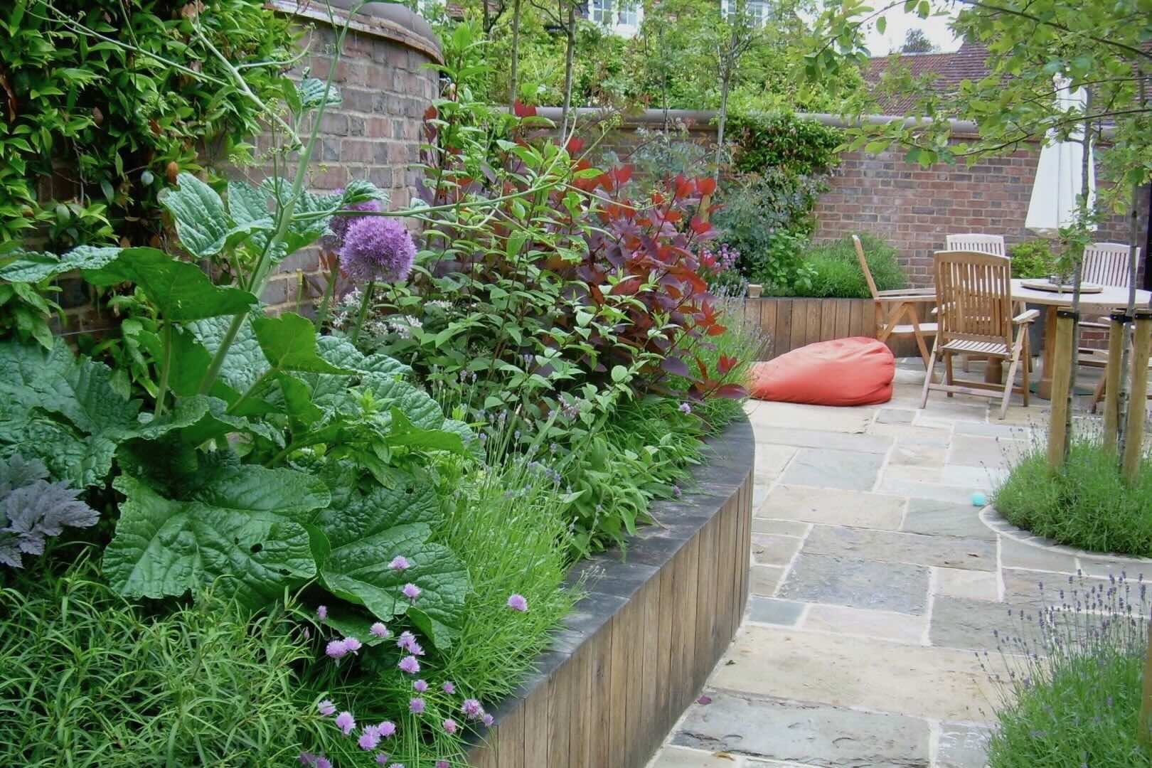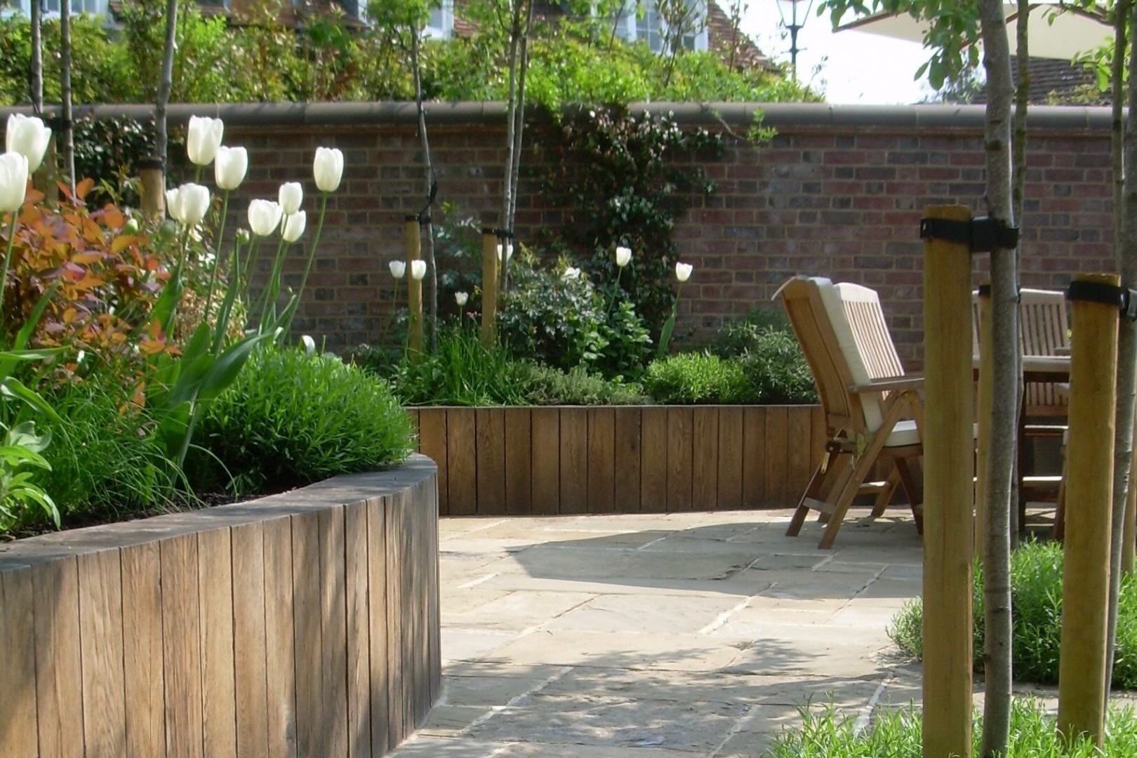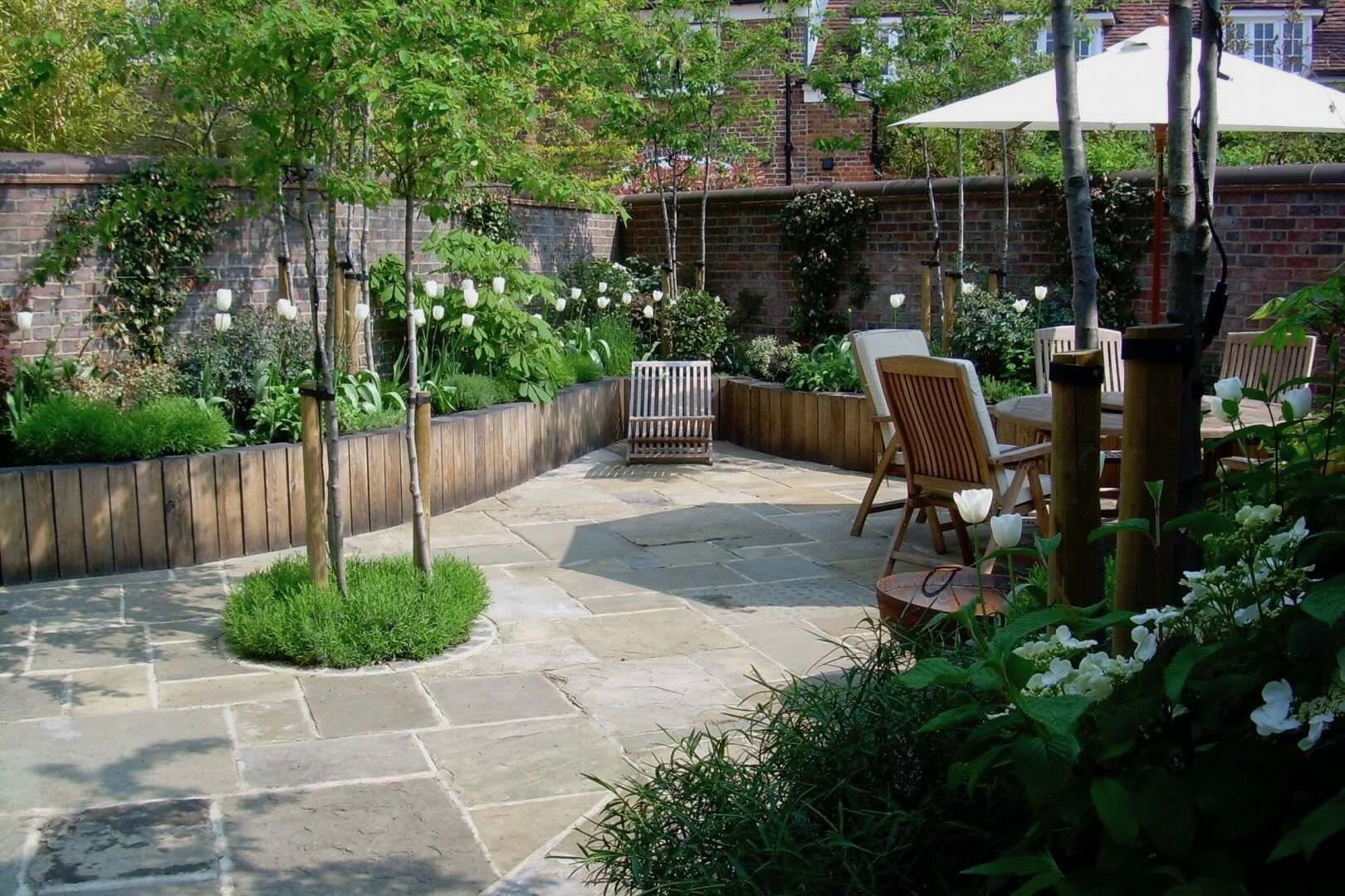 This walled courtyard garden combines traditional York stone flags with raised planting beds crafted from solid oak, filled with soft, classic planting. Groups of multi-stemmed, flowering trees are thoughtfully arranged throughout the space, creating layers of height, colour, and texture.